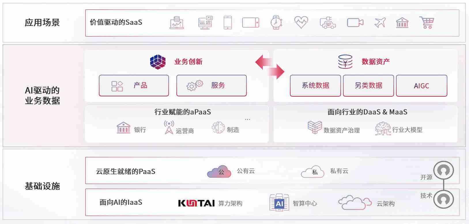 数字时代,,围绕企业数字化转型的关键要素,,尊龙z6数码开创性的提出数云融合战略和技术体系框架,,着力在云原生、、、数字原生、、AI原生和信创产业上架构产品和服务能力,,,为处在不同数字化转型阶段的快消零售、、、汽车、、、、金融、、、医疗、、政企、、、、教育、、、运营商等行业客户提供泛在的敏捷IT能力和融合的数据驱动能力,,,,构建跨界融合创新的数字业务场景和新业务模式,,,助力企业级客户建立面向未来的核心能力和竞争优势,,,,全面推动社会的数字化、、、、智能化转型升级。。。。