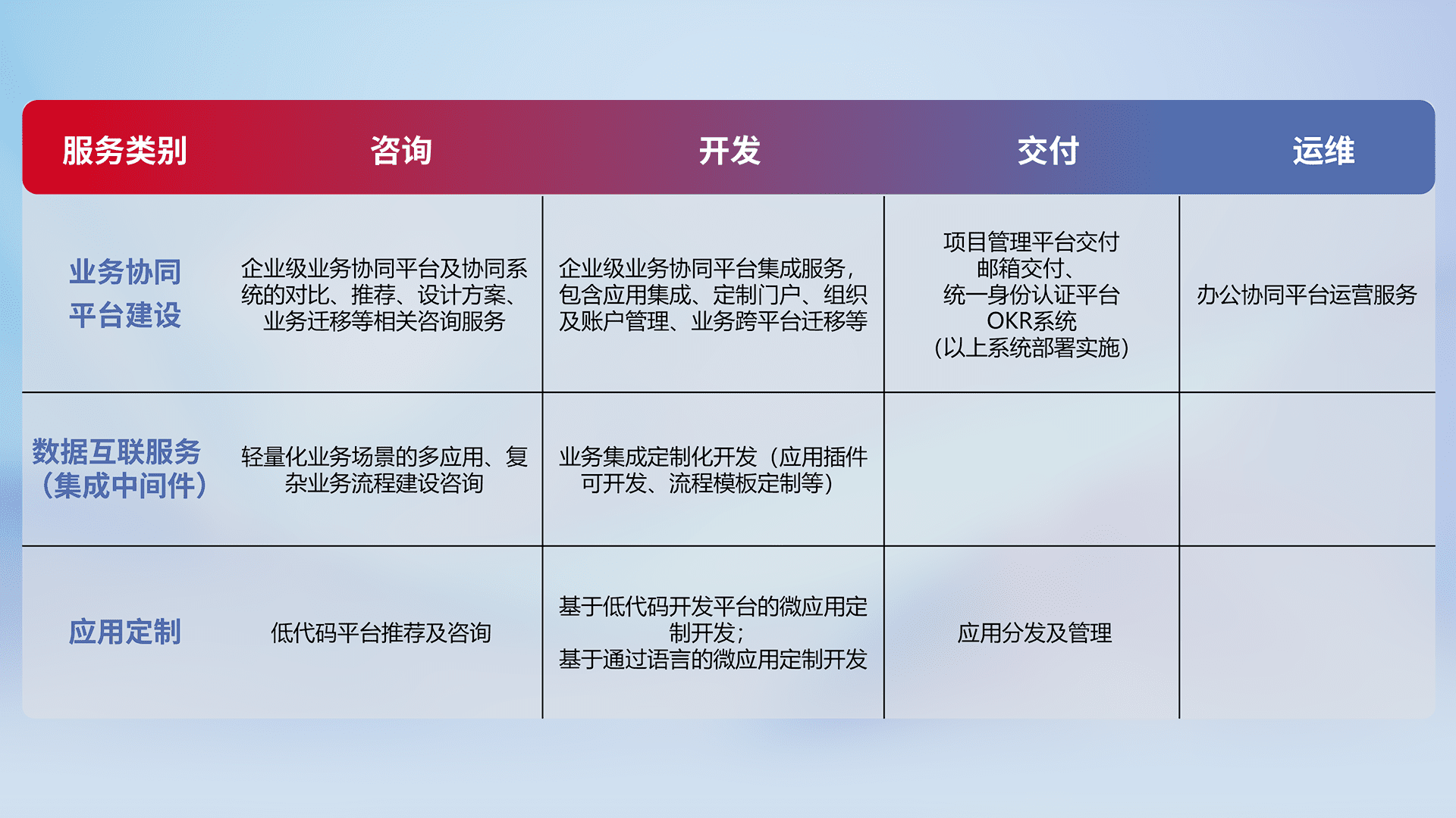 针对钉钉、、、企微、、、、IDaas等平台级产品提供产品的规划、、方案、、、、交付、、、、定制化开发等服务,,,实现如统一协同办公、、、智能客户服务、、混合会议管理、、智能数据查询、、等业务场景,,,实现数字化转型。。。
