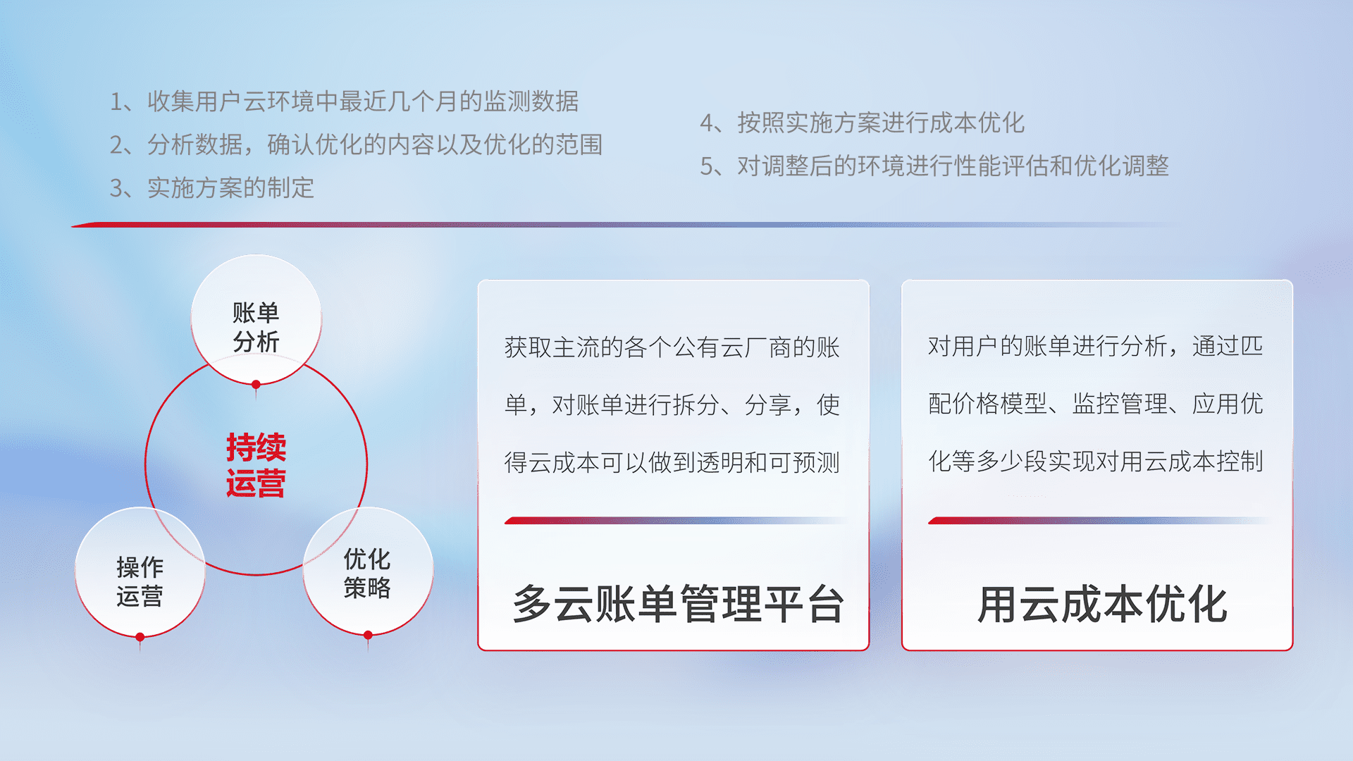 通过多云纳管,,,,以统一的资源数据模型把客户的云资源进行抽象和封装,,进而实现对多云资源的统一操作,,,,保障云资源管理的可靠性、、、稳定性与可用性。。。量身定制化运维内容,,,,配置、、、、开发运维、、、补丁管理、、、、备份、、、监控、、、、认证和访问管理、、、审计和日常巡检等,,,,保障在用云过程中的可靠度,,稳定度以及高可用率。。。。